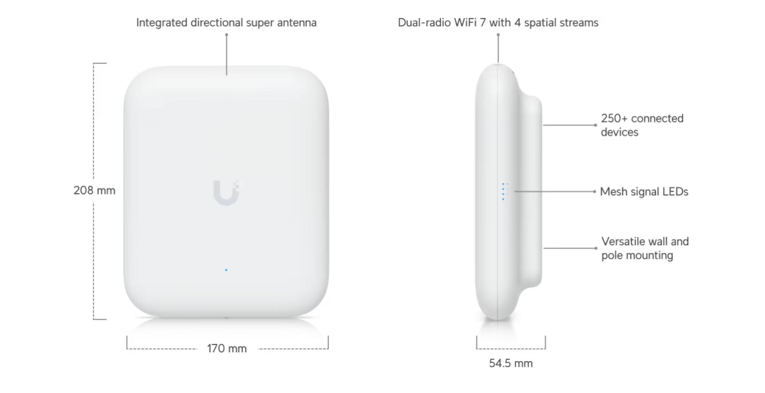 Der U7 Outdoor ist ein Wi‑Fi‑7‑fähiger, wetterfester Access Point für den Außenbereich. Er bietet hohe Reichweite, starke Performance und eignet sich ideal für Gärten, Terrassen, Außenanlagen, Firmenareale oder Hotspots.